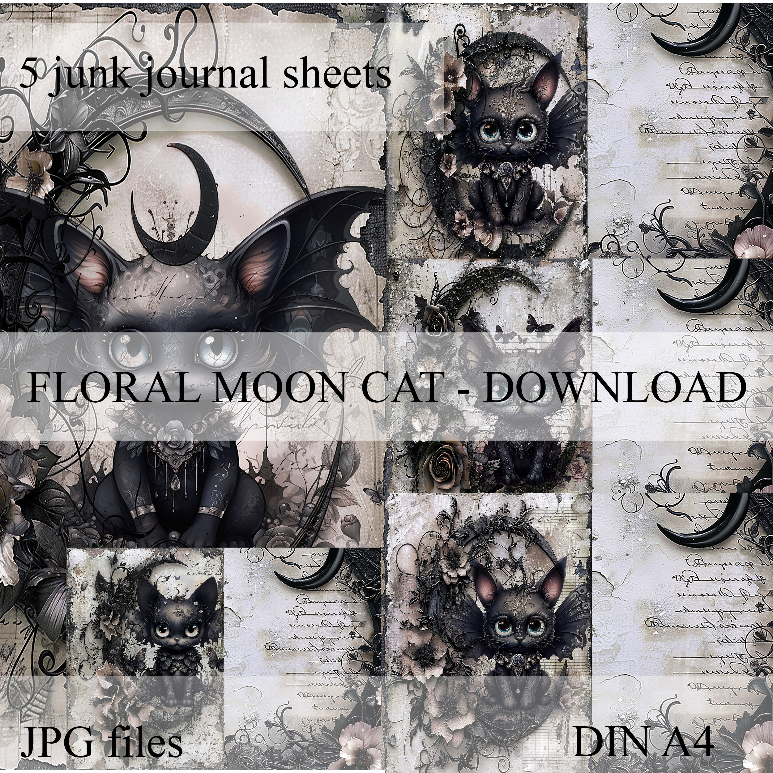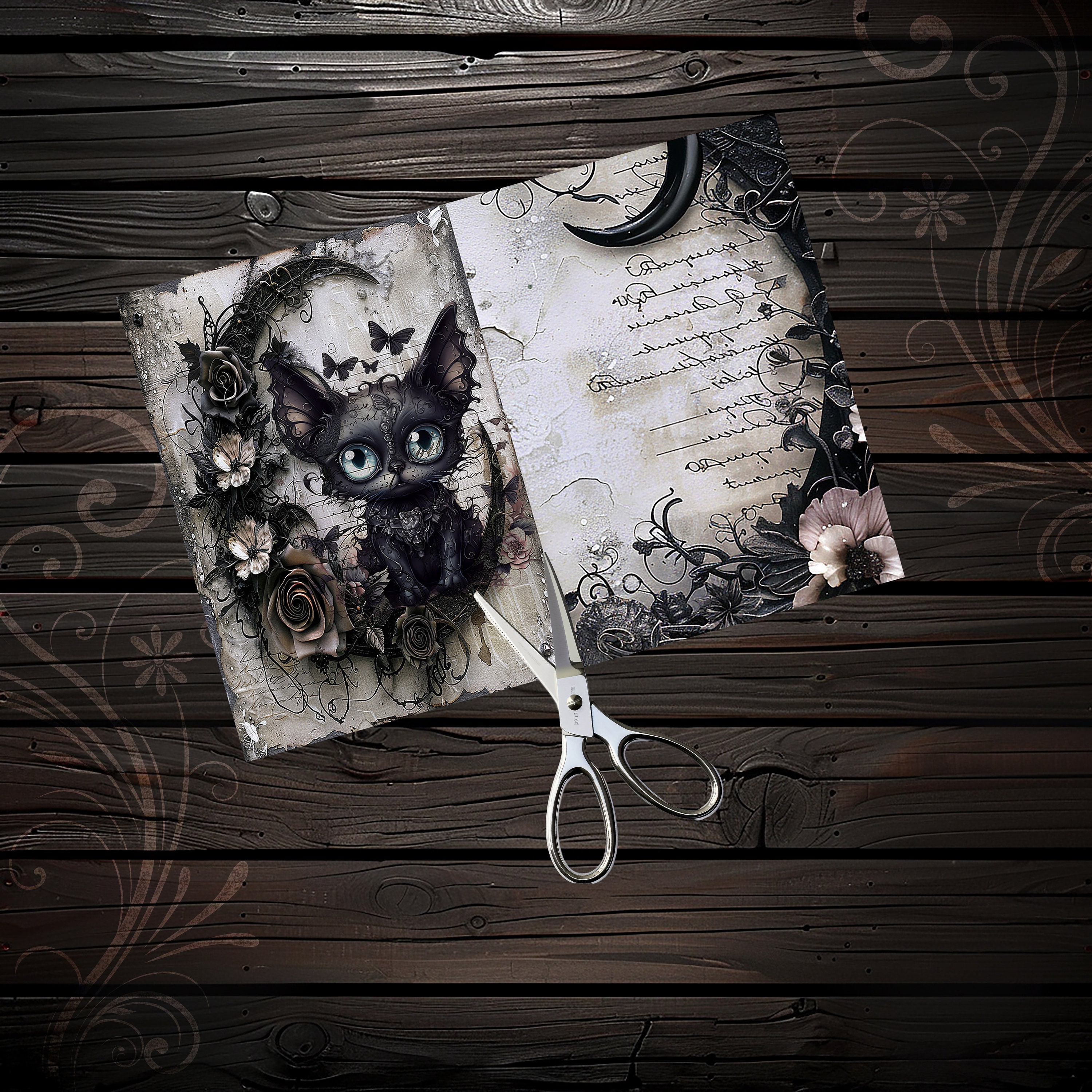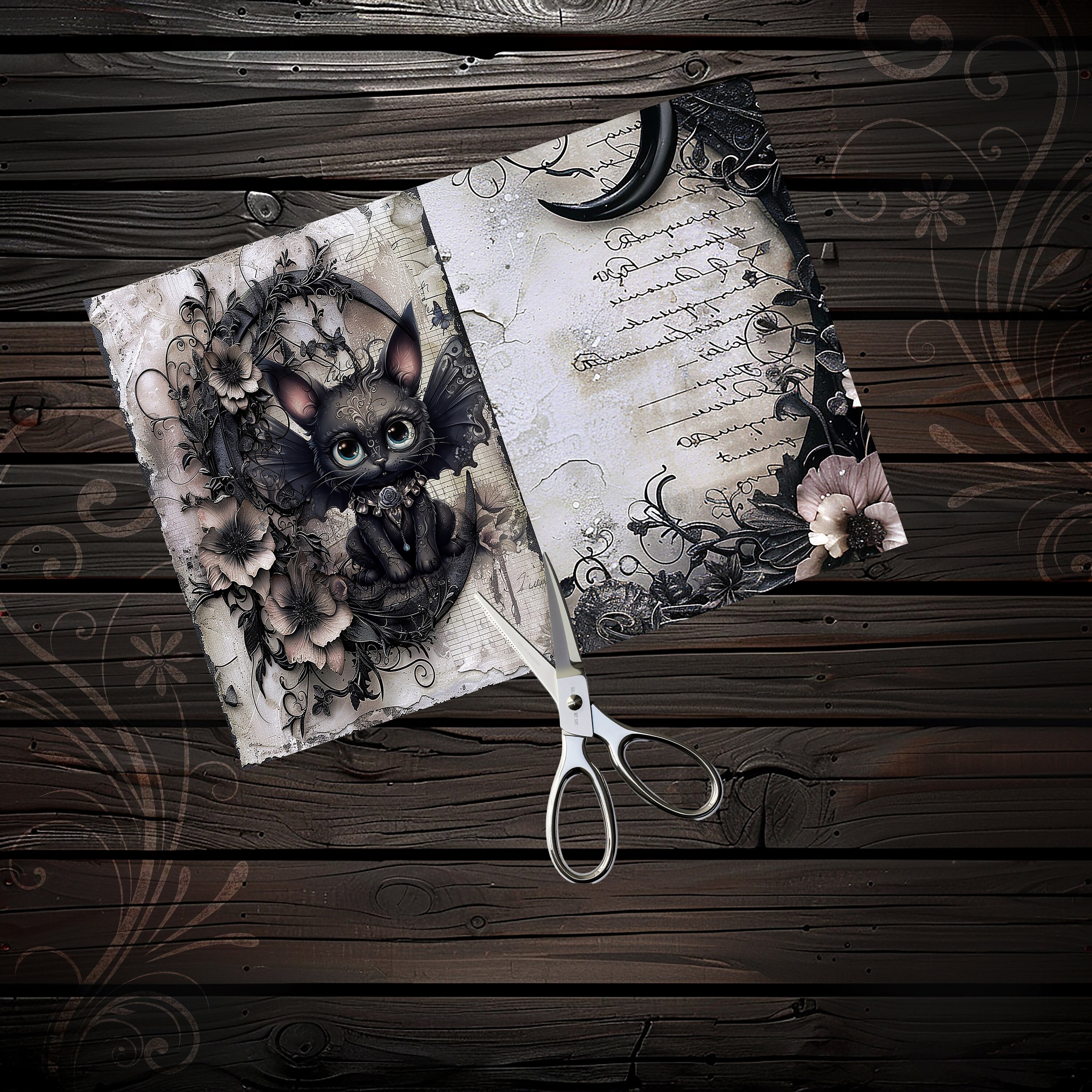 Scrapbooking papers, floral, moon, cat, goth girl, junk journal, wallart, wallpaper, gothic, fantasy, scrapbooking collage