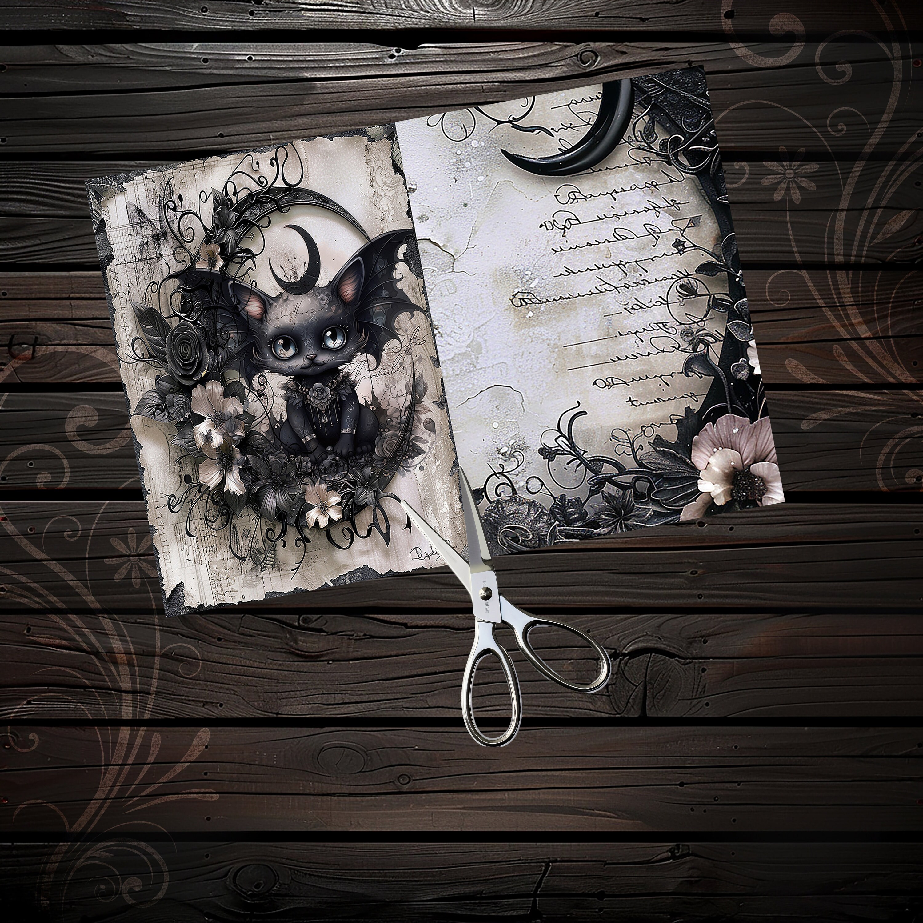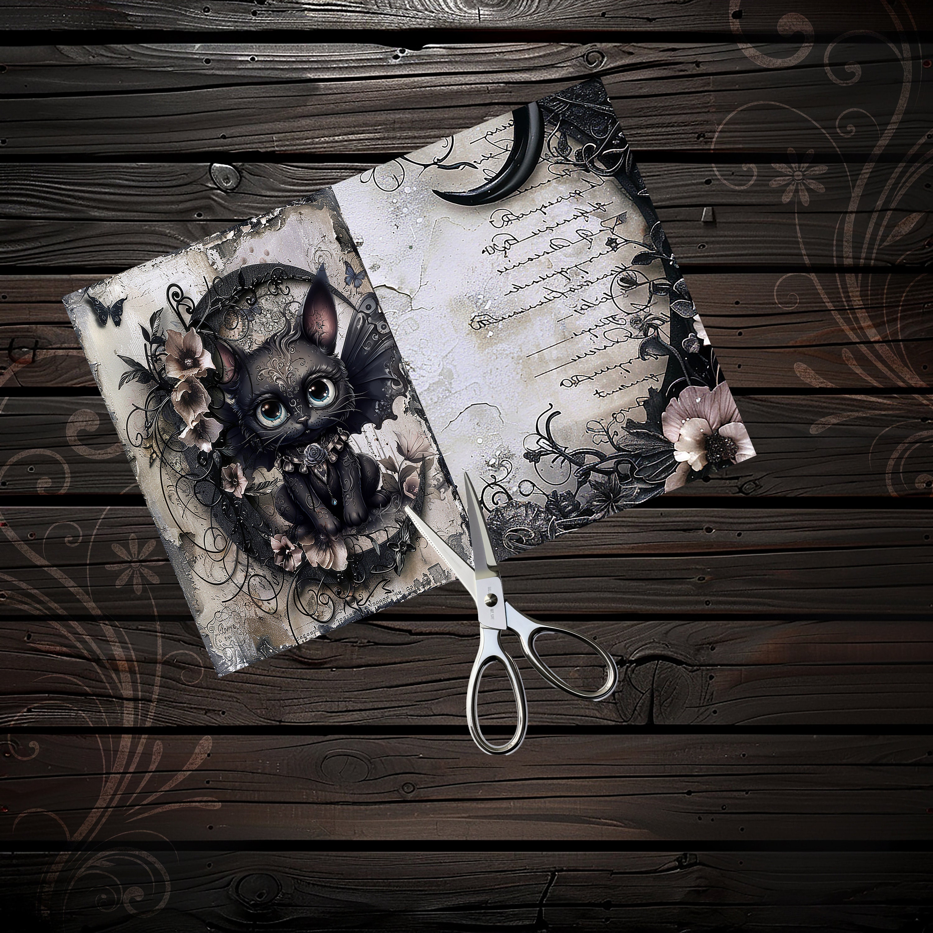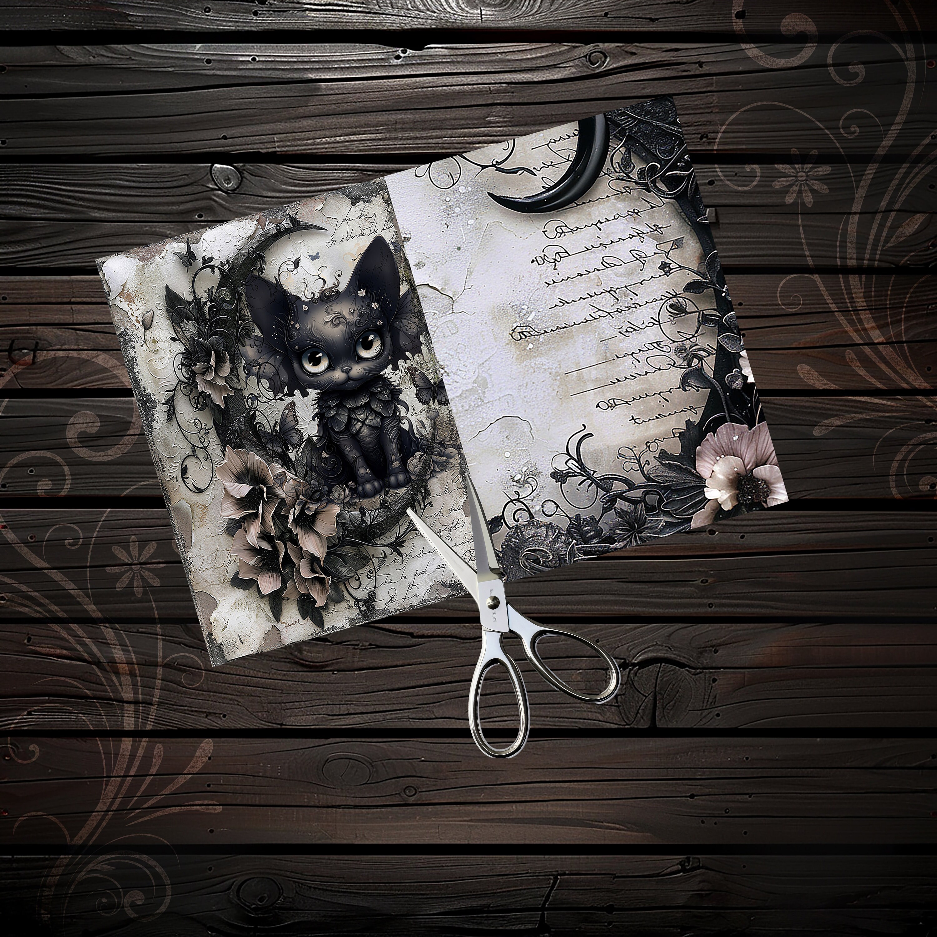 Scrapbooking papers, floral, moon, cat, goth girl, junk journal, wallart, wallpaper, gothic, fantasy, scrapbooking collage