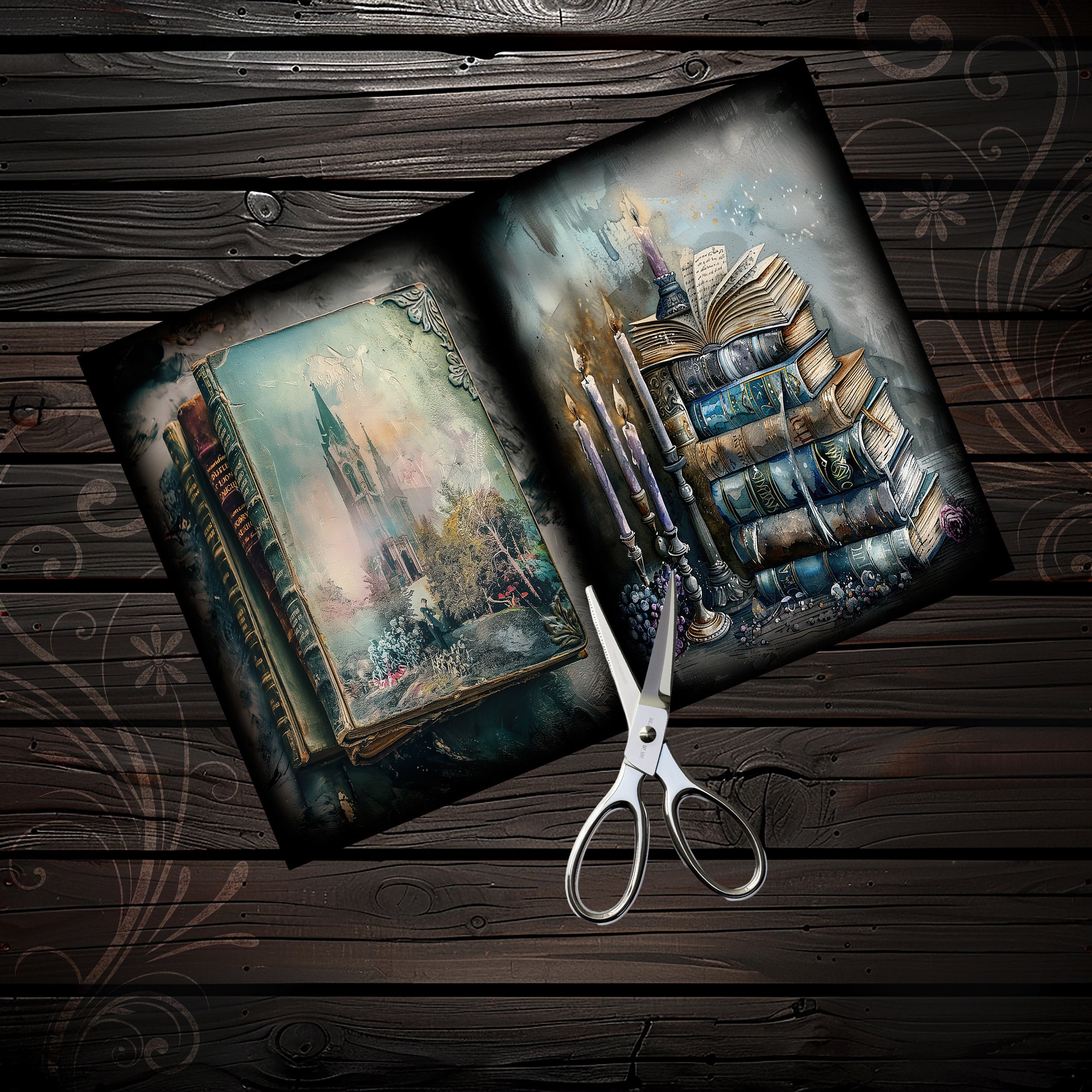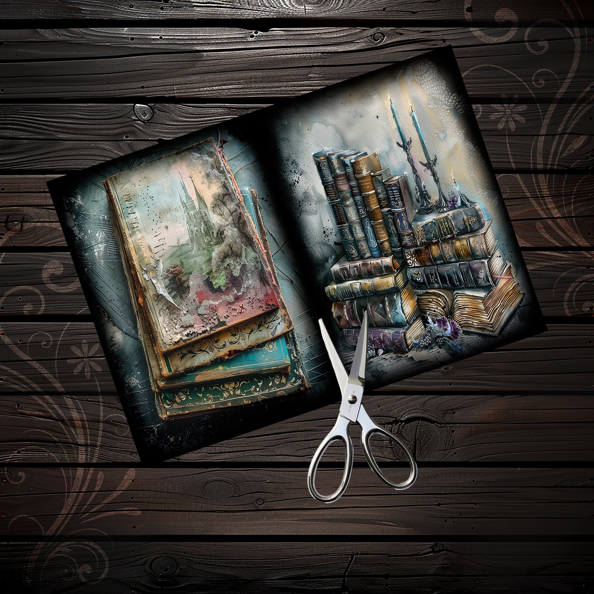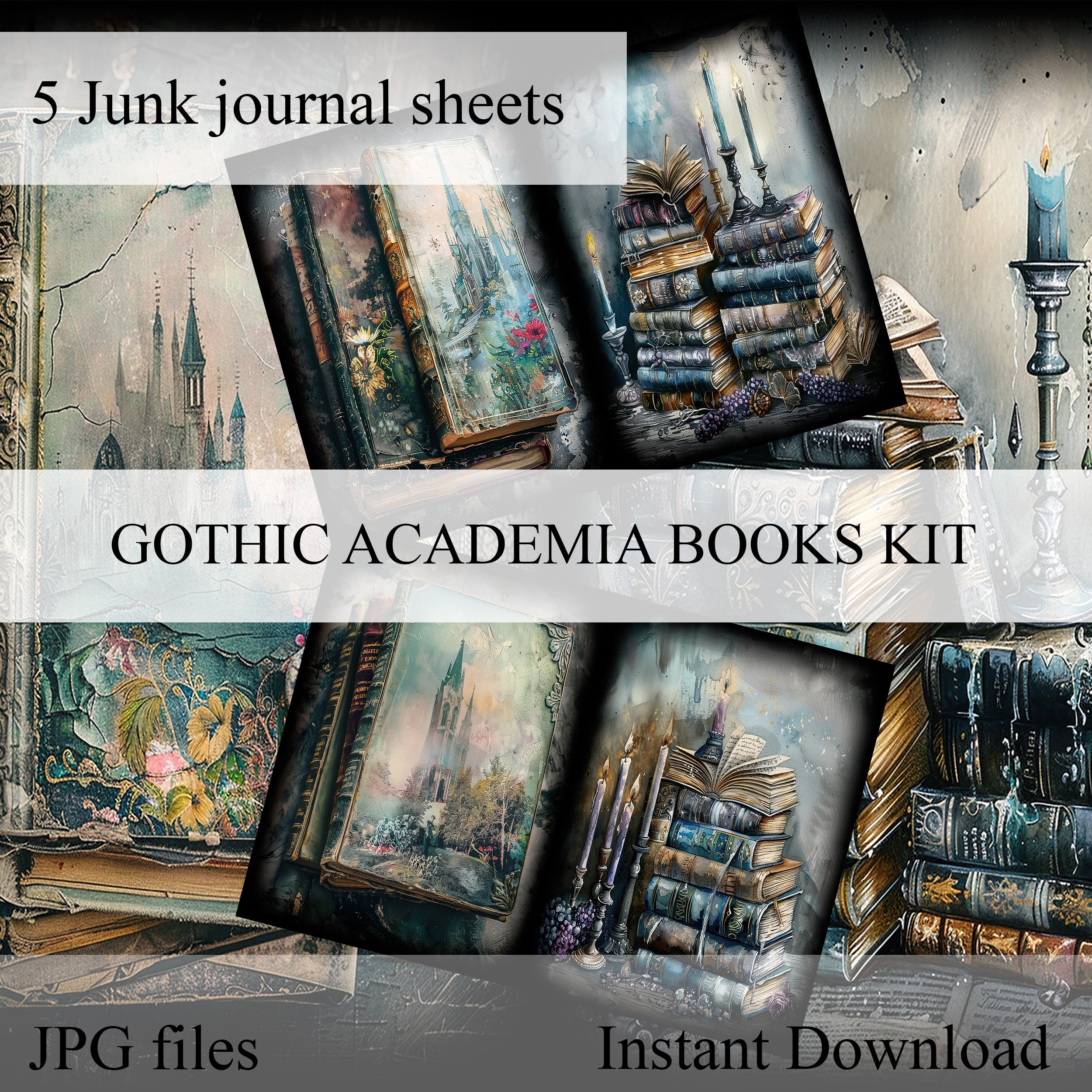 Gothic junk journal books, scrapbook, scrapbooking, kit, scrapbooking kit, collage, fantasy, ephemera, digital paper, sheets