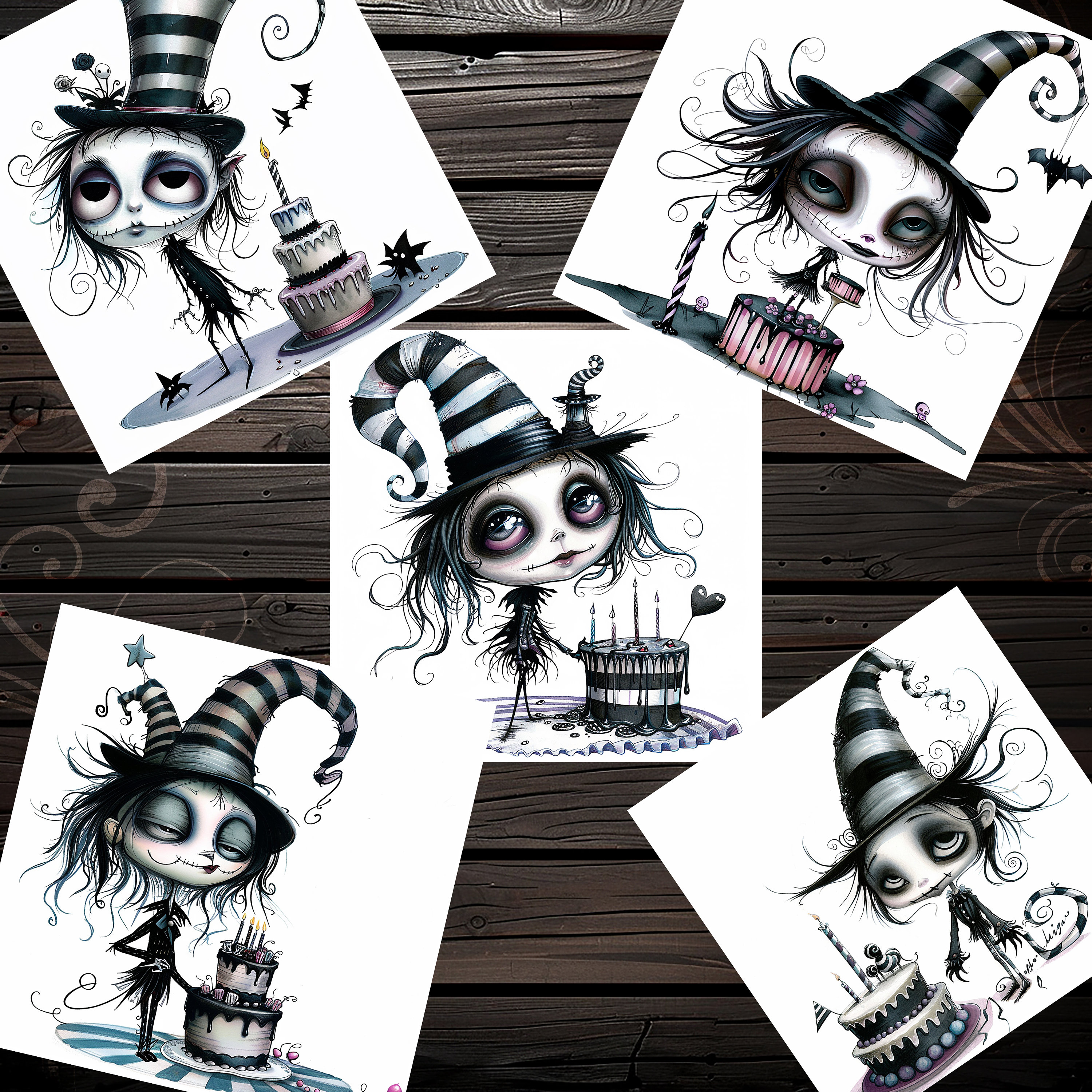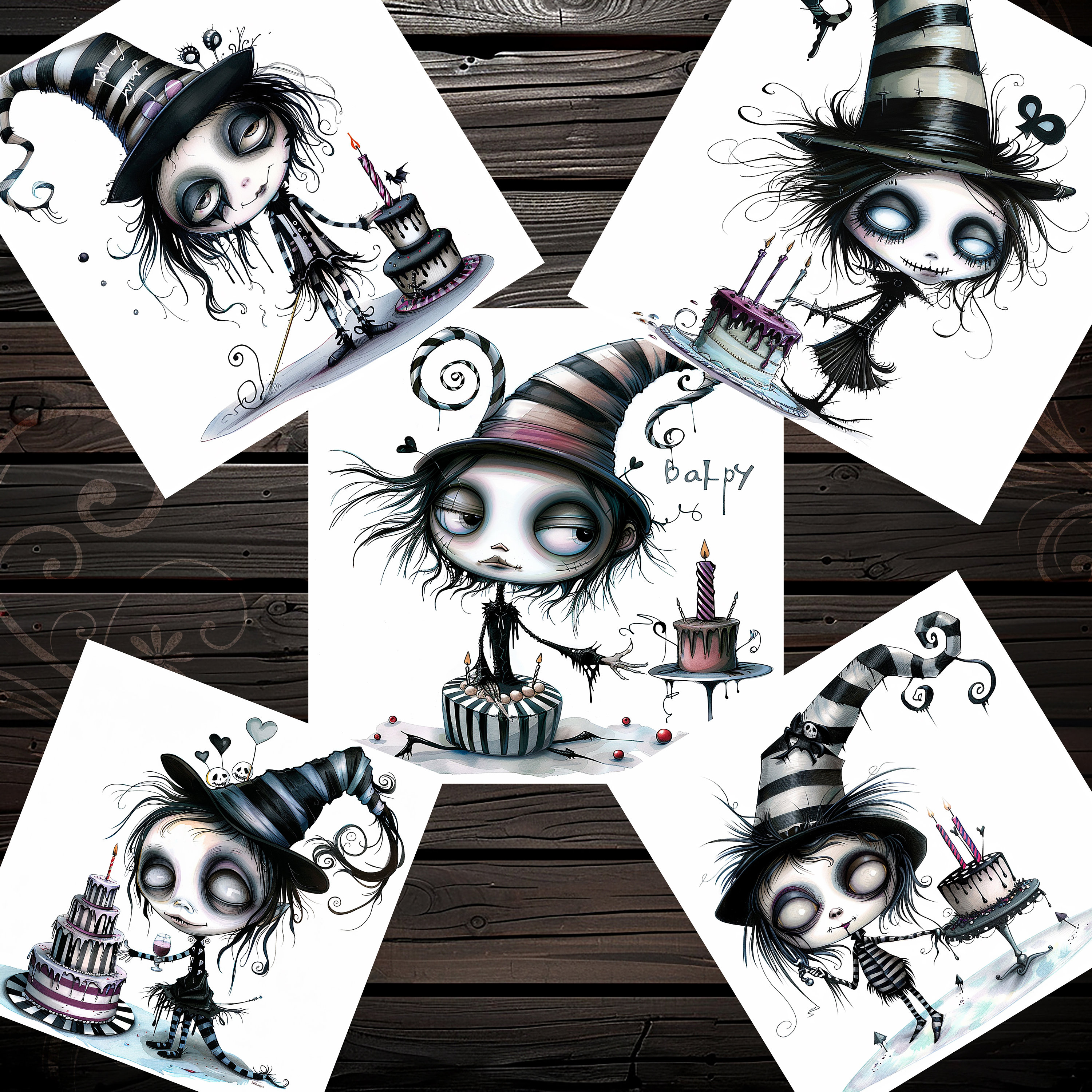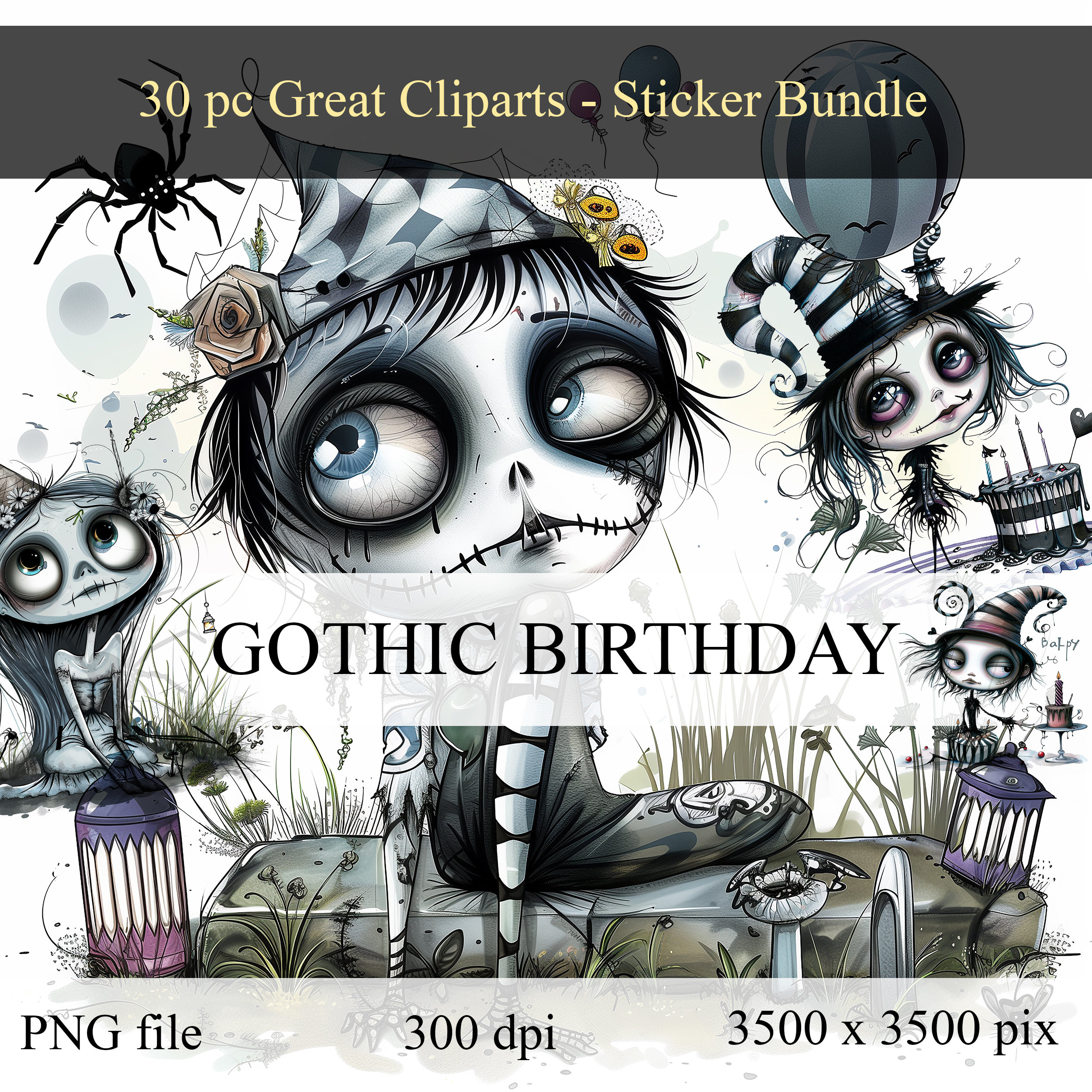 Clip arts gothic birthday stickers, junk journal sticker, scrapbooking stickers, ephemera, digital, Tim Burton style, printable paper